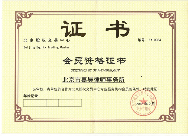 北京市嘉昊律师事务所获得北京市股权交易中心会员证书,为服务企业提供新三板、新四板法律服务。
