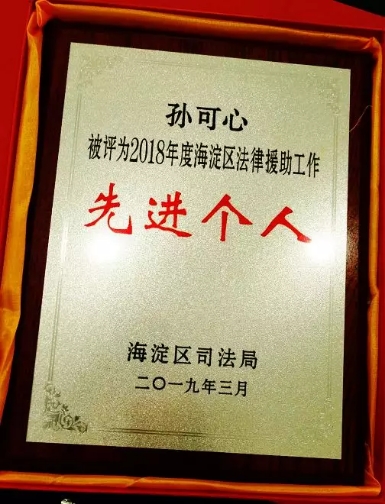 海淀区法律援助中心以人权保护和维护司法公正与平衡为出发点和落脚点。嘉昊律师长年以来,用行动支持法援工作,肩负使命、不辱使命,通过向缺乏能力、经济困难的当事人提供法律帮助,使他们能平等地站在法律面前,享受平等的法律保护,被评选为2018年度先进集体,孙可心律师更是荣获先进个人。